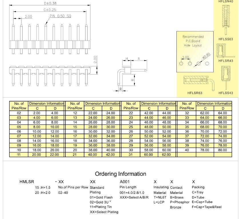 2.0mm pitch single row right angle pin header